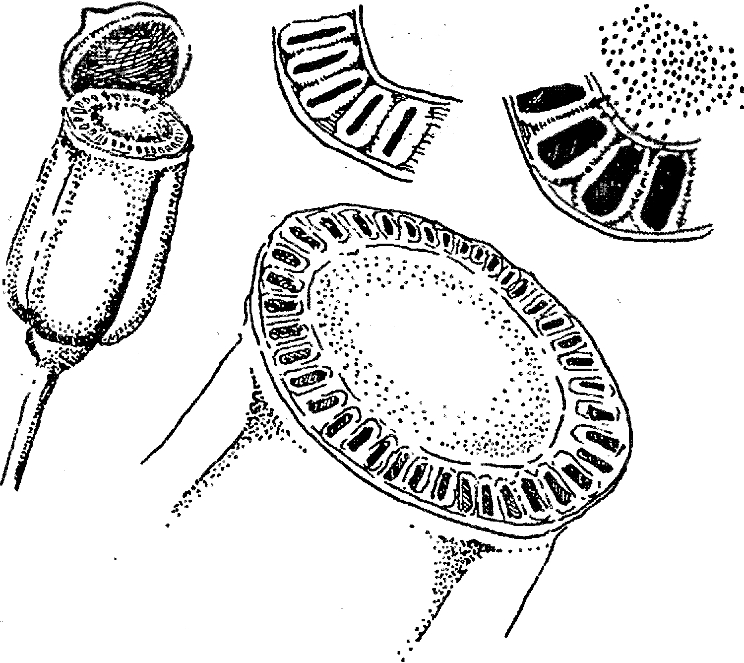 Несколько по–другому происходит рассеивание спор у кукушкина льна и других видов рода политрихум. При созревании спорангия крышечка опадает, открывая кольцо зубцов, окружающих щелевидное отверстие по краям коробочки. Роль этих зубцов очень важна: они регулируют высыпание спор и защищают их от намокания – тяжелая, мокрая спора далеко не улетит. Во влажную погоду зубцы набухают и, изгибаясь, закрывают устье коробочки.