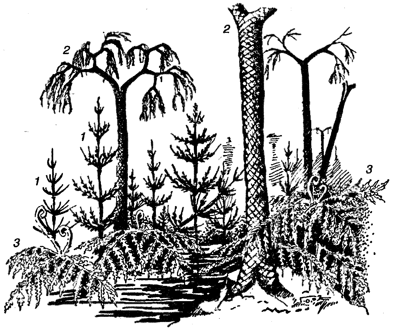 Лес каменноугольного периода:1 – каламиты: 2 – лепидодендроны: 3 – семенныепапоротники