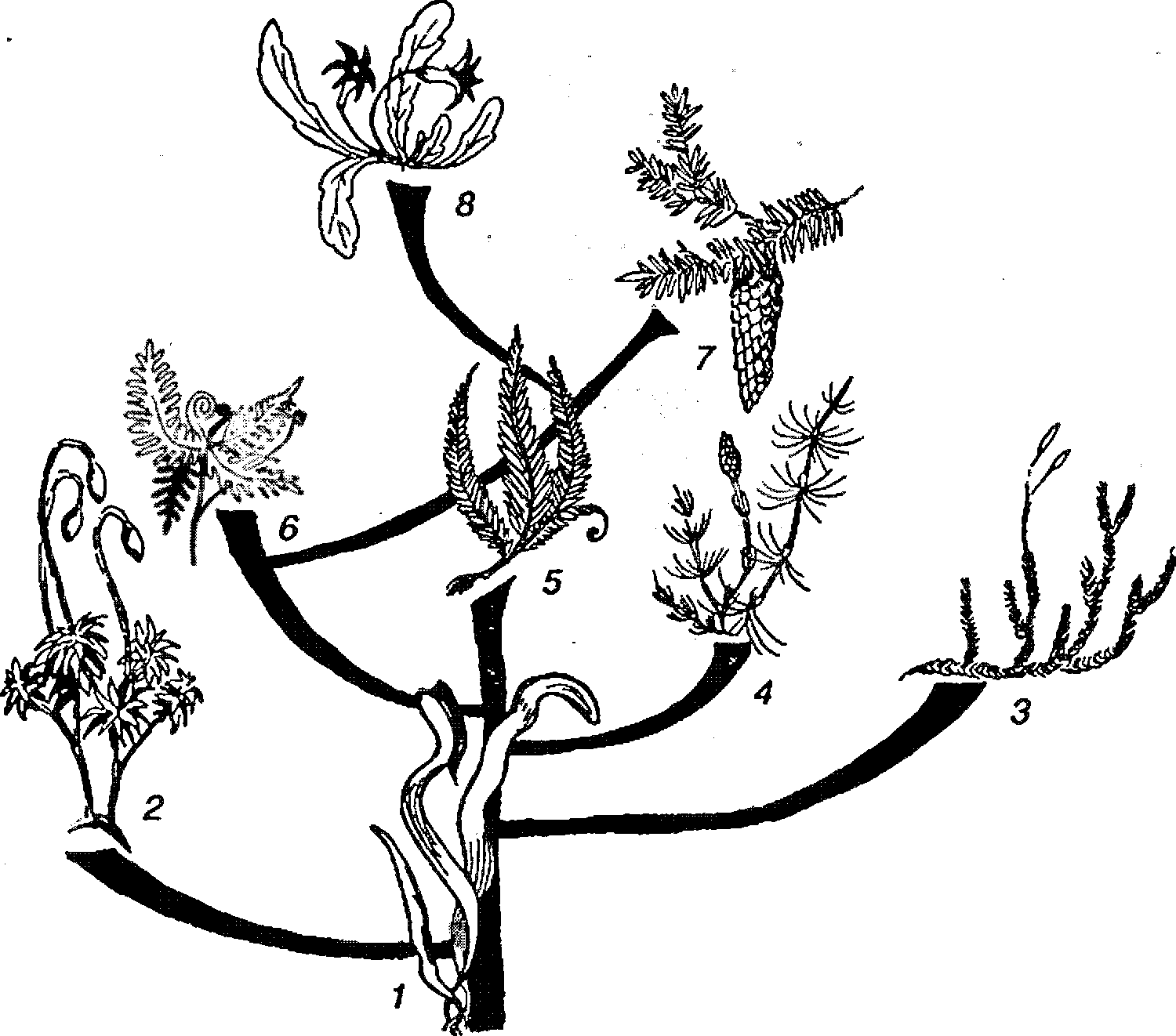 Эволюционное древо царства растенийI – водоросли (низшие растения); 2 – мхи; 3 – плауны, 4 – хвощи; 5 – папоротники; 6 – семенные папоротники; 7 – голосеменные; 8 – цветковые
