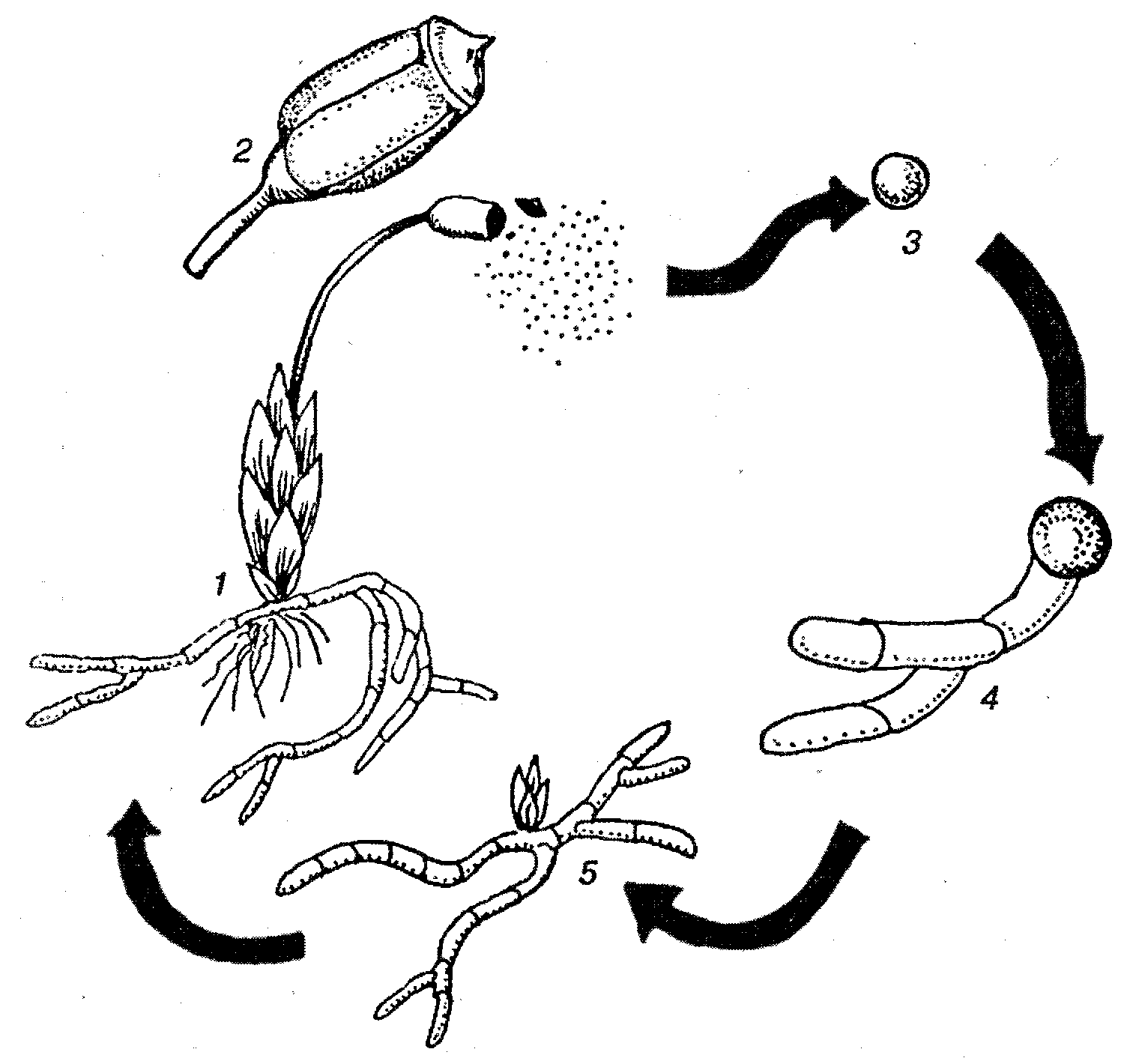 Жизненные стадии мха. 1 – слоевище; 2 – спорангий (коробочка); 3 – спора; 4 – первонить; 5 – почка на первонити