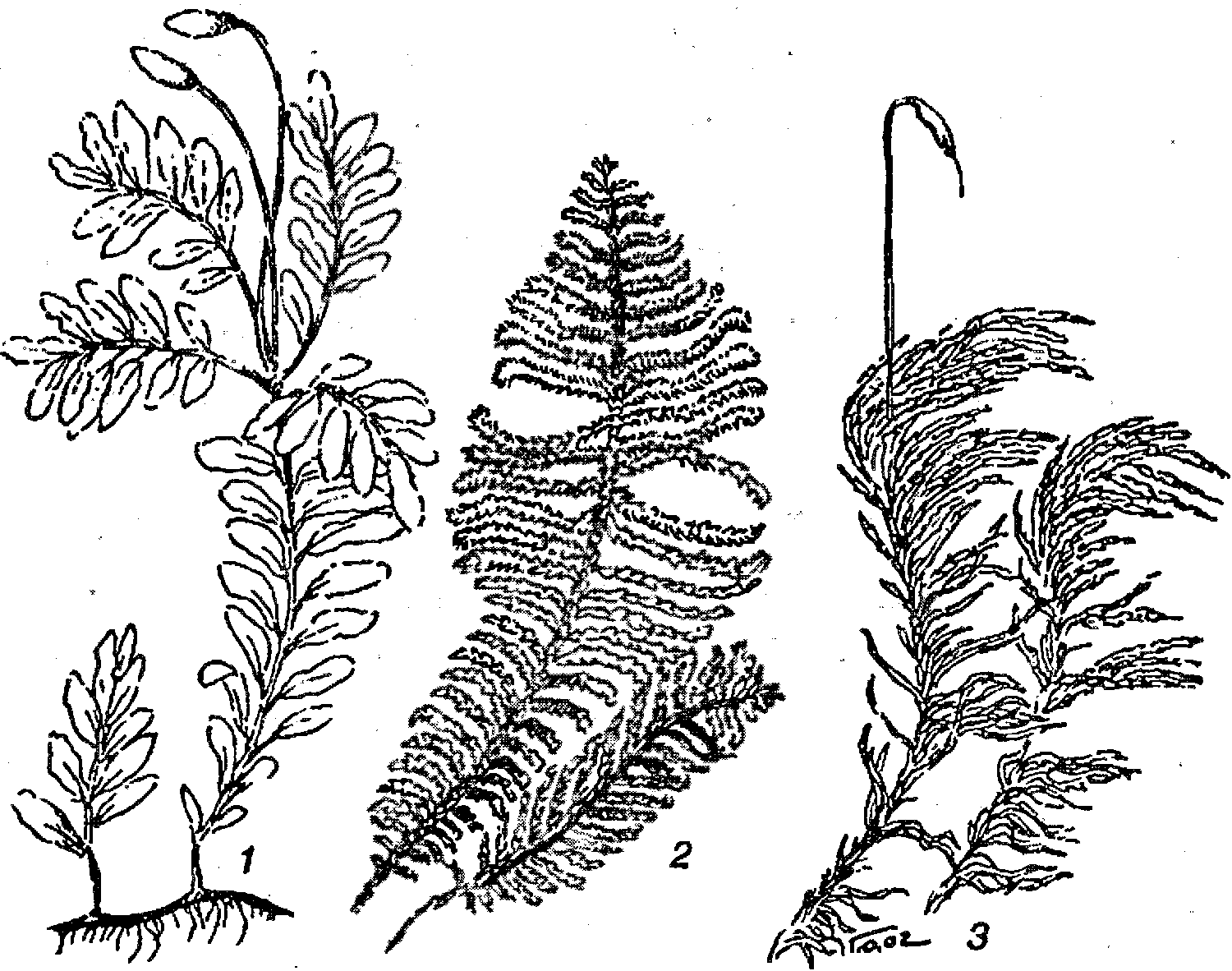 Листостебельные мхи. 1 – мниум волнистый; 2 – птилиум гребенчатый (страусово перо); 3 – дикранум метловидный