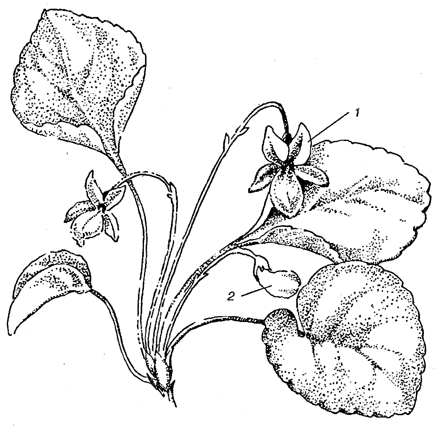 Фиалка удивительная. 1 – бесплодные цветки; 2 – плодущие нераскрывающиеся цветки
