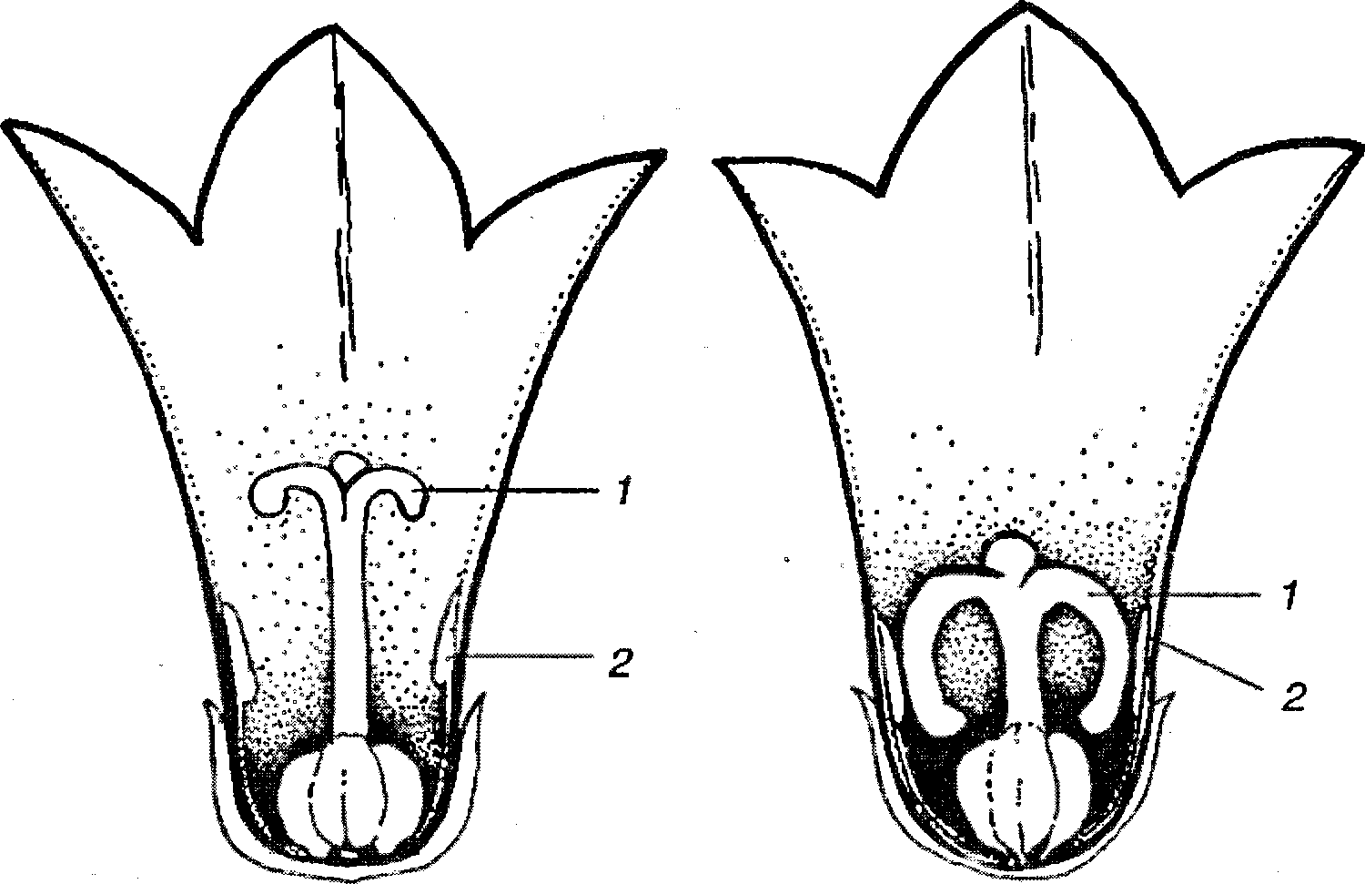 Цветок колокольчика в начале цветения (слева) и в конце цветения (справа), если перекрестное опыление не состоялось. 1 – рыльце; 2 – тычинки