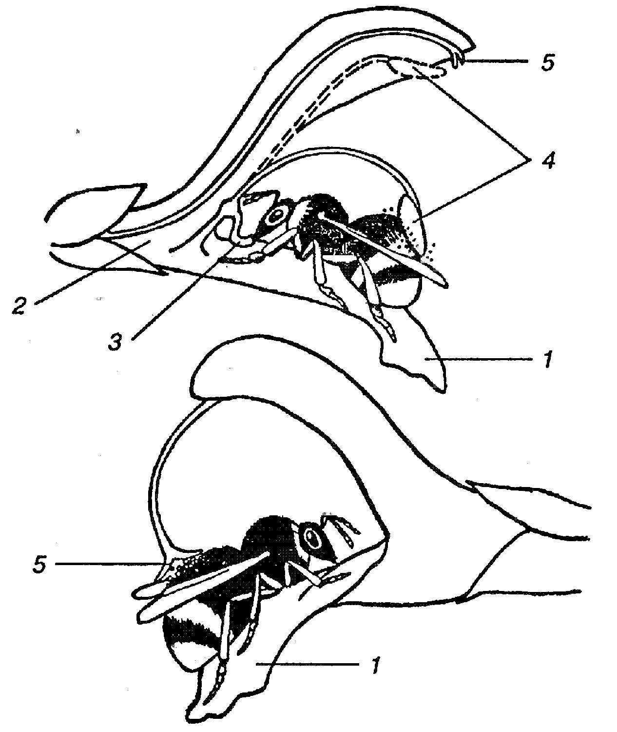 Механизм опыления у шалфея1 – посадочная площадка; 2 – расположение нектарников; 3 – «педаль» тычинки; 4 – пыльник; 5 – рыльце