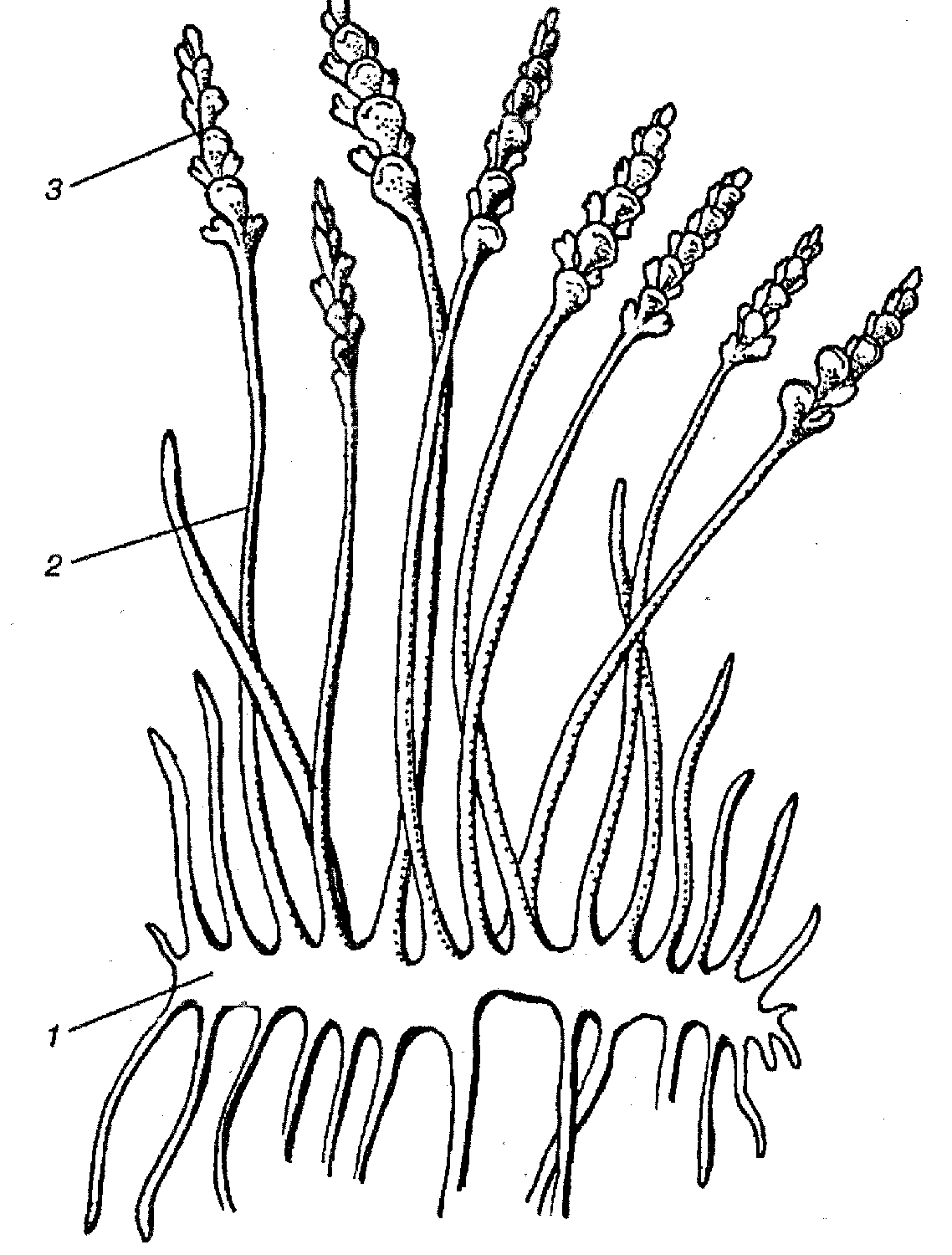 Зостерофиллофит. 1 – «корневище»; 2 – надземные «побеги»; 3 – спорангии