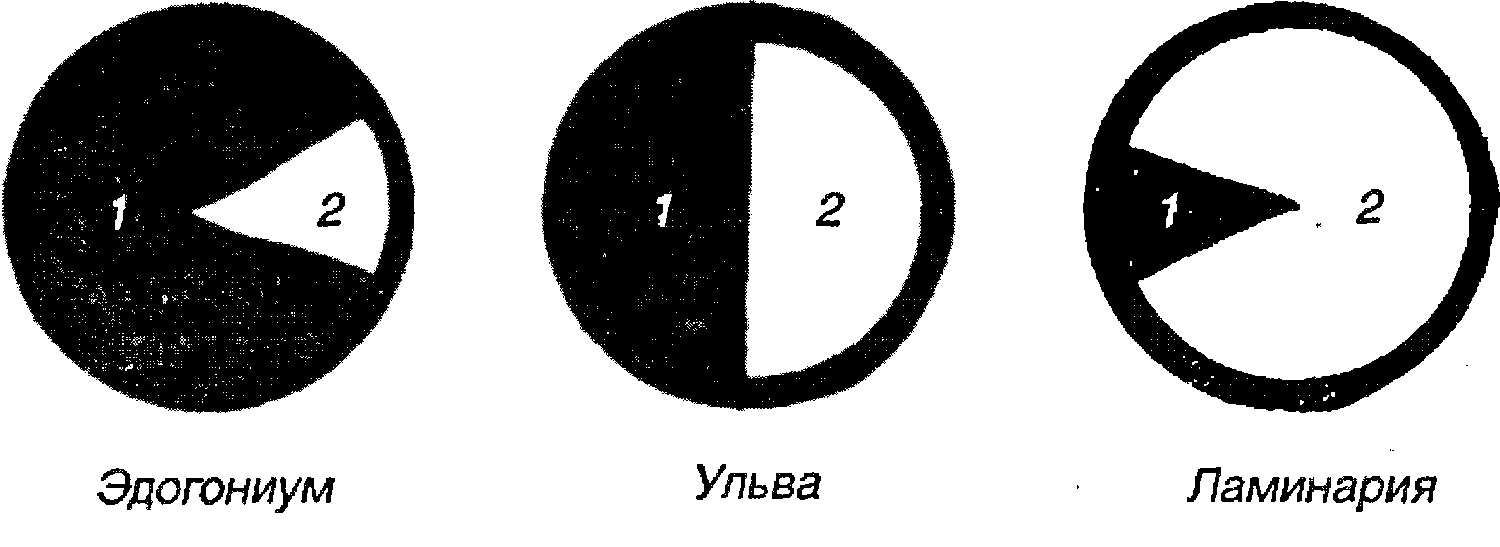Соотношение стадий гаметофита и спорофита в жизненном цикле различных водорослей: 1 – гаметофит; 2 – спорофит