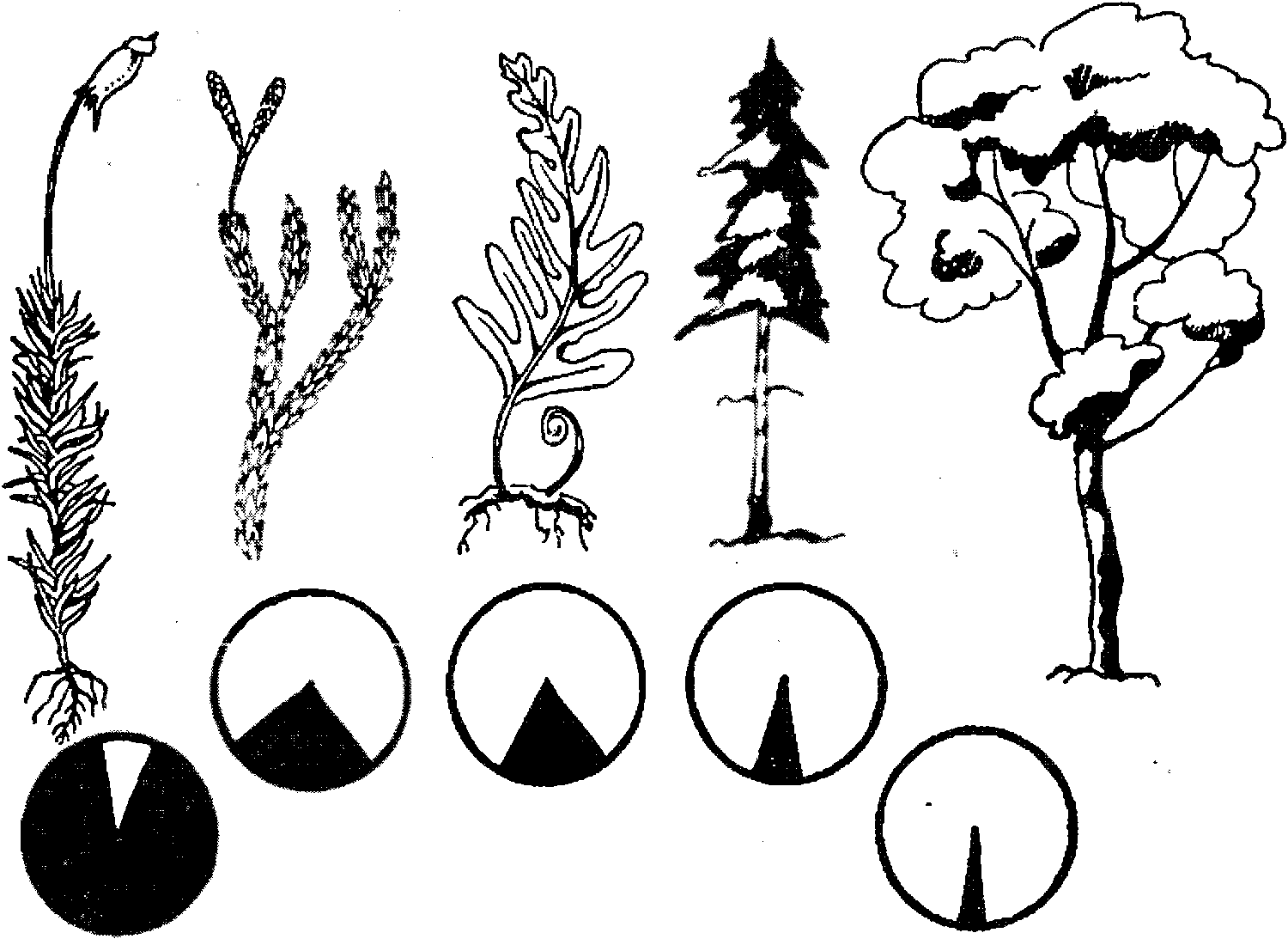 Соотношение стадий гаметофита и спорофита в жизненном цикле мхов, плаунов, папоротников,голосеменных и цветковых