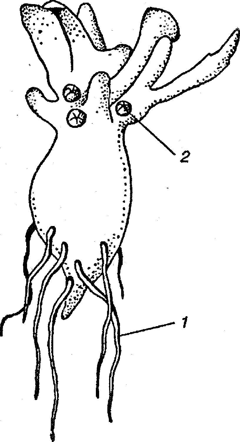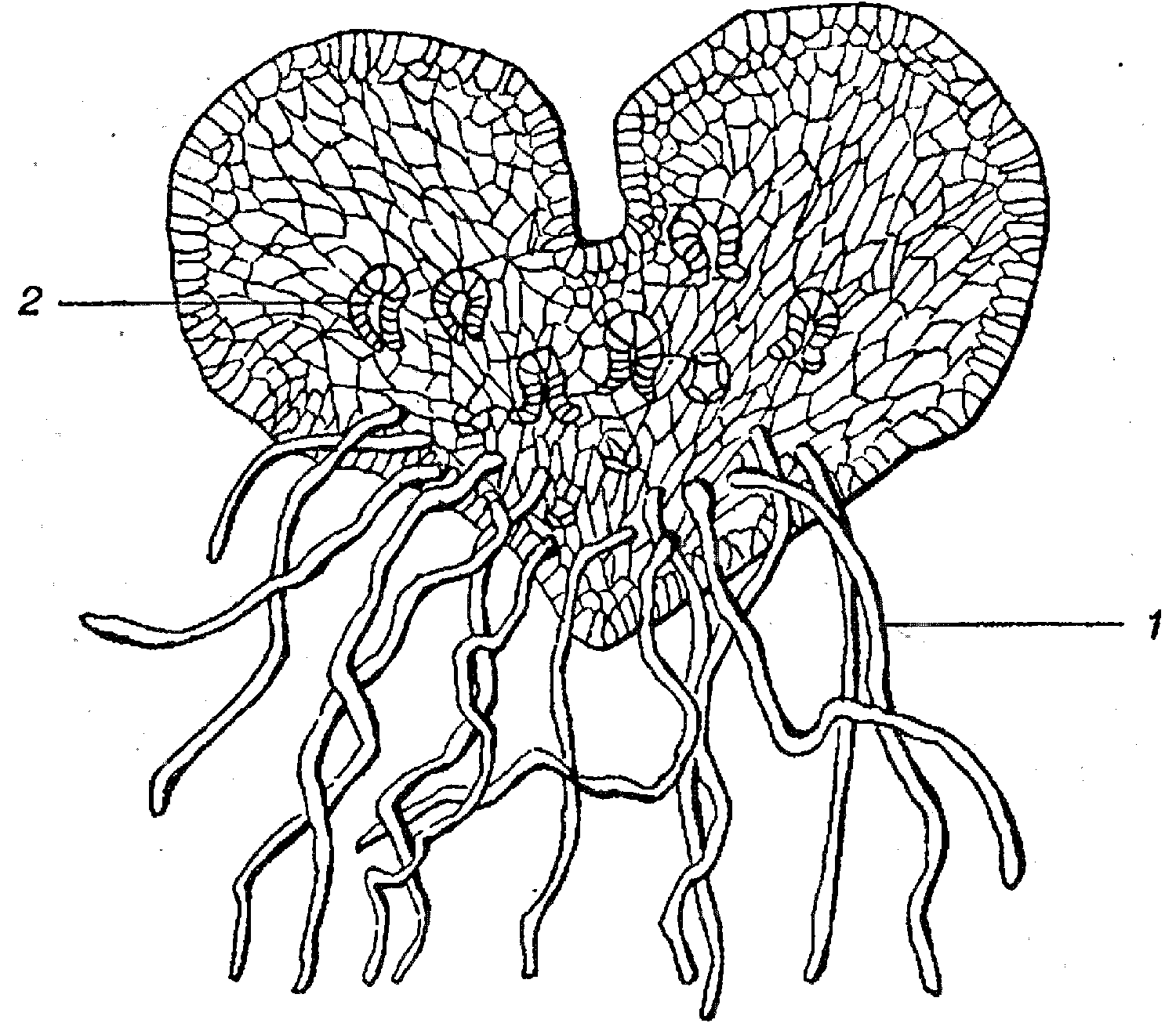 Гаметофит (заросток) плауна: 1 – ризоиды;2 – половые органы (архегонии и антеридии)