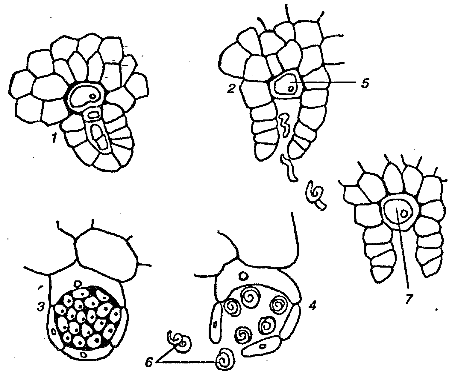 Половые органы споровых растений. 1 – незрелый архегоний; 2 – зрелый архегоний; 3 – незрелый антеридий; 4 – зрелый антеридий; 5 – яйцеклетка; 6 – сперматозоиды; 7 – оплодотворенная яйцеклетка (зигота)