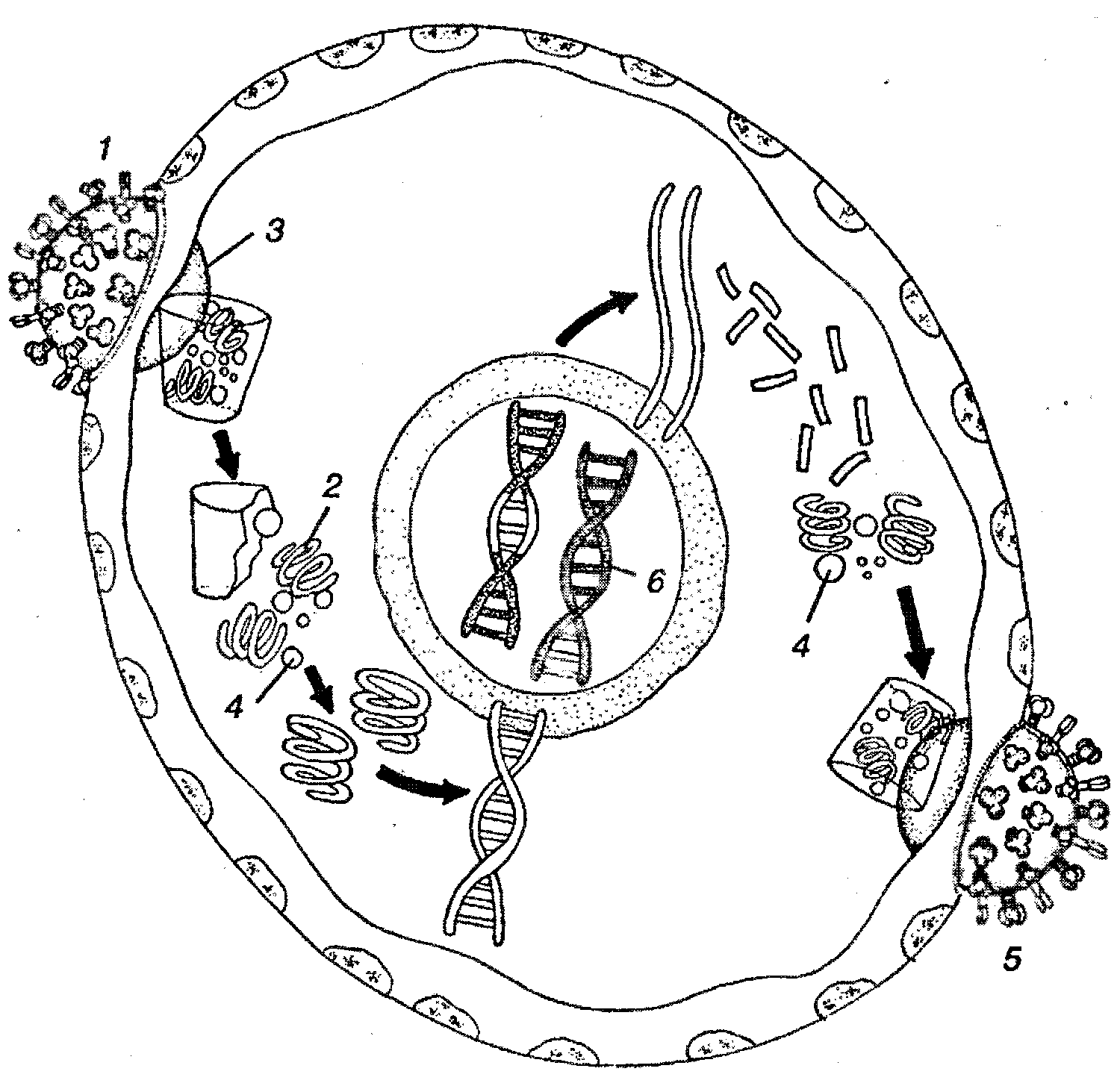 Цикл развития вирусной частицы: 1 – прикрепление вируса, к мембране клетки–хозяина; 2 – нуклеиновая кислота вируса; 3 – белковая оболочка вируса; 4 – белки вируса; 5 – готовая вирусная частица; 6 – ДНК хозяина.