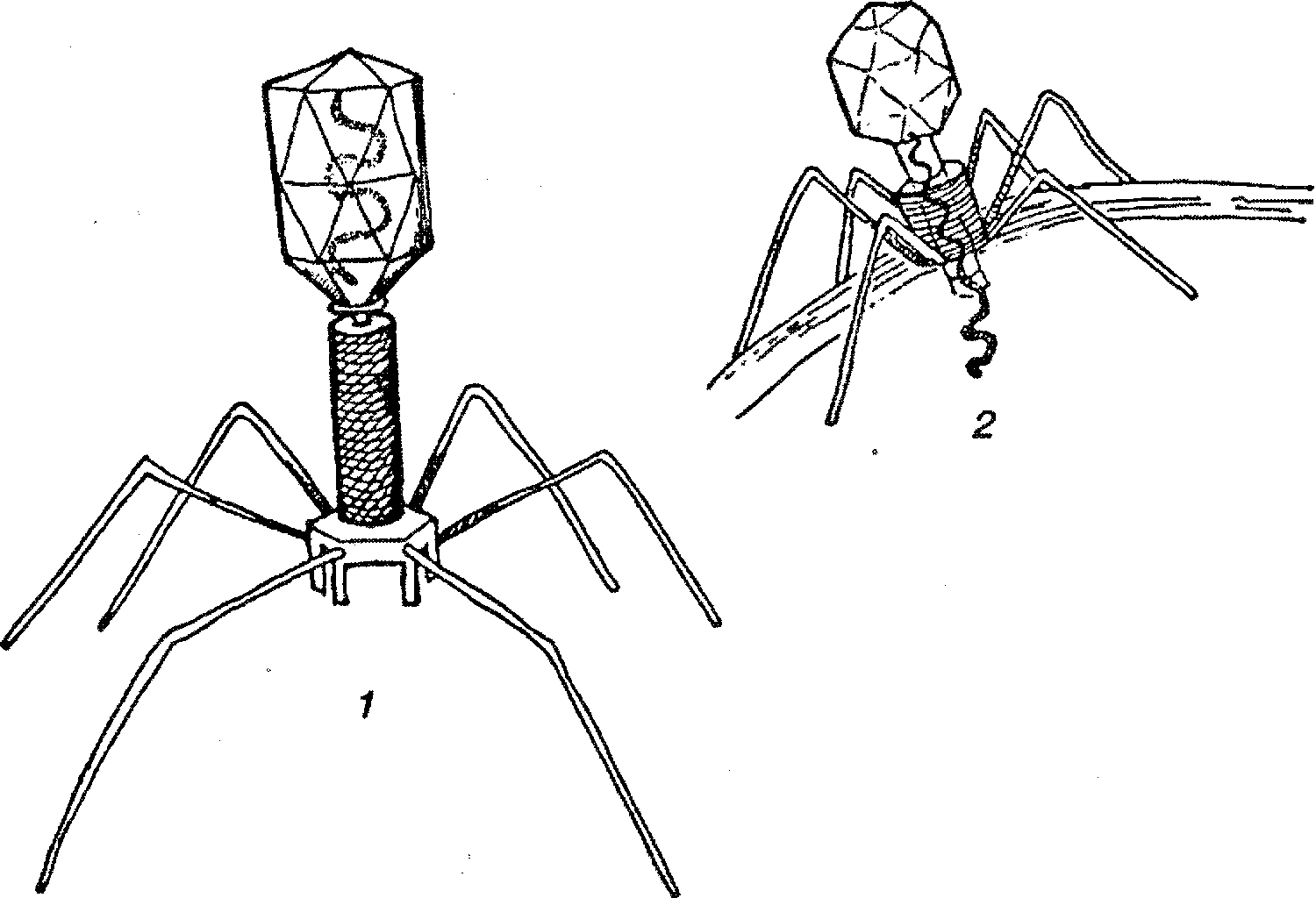 Бактериофаги: 1 – общий вид вирусной частицы; 2 – «впрыскивание» ДНК в клетку бактерии