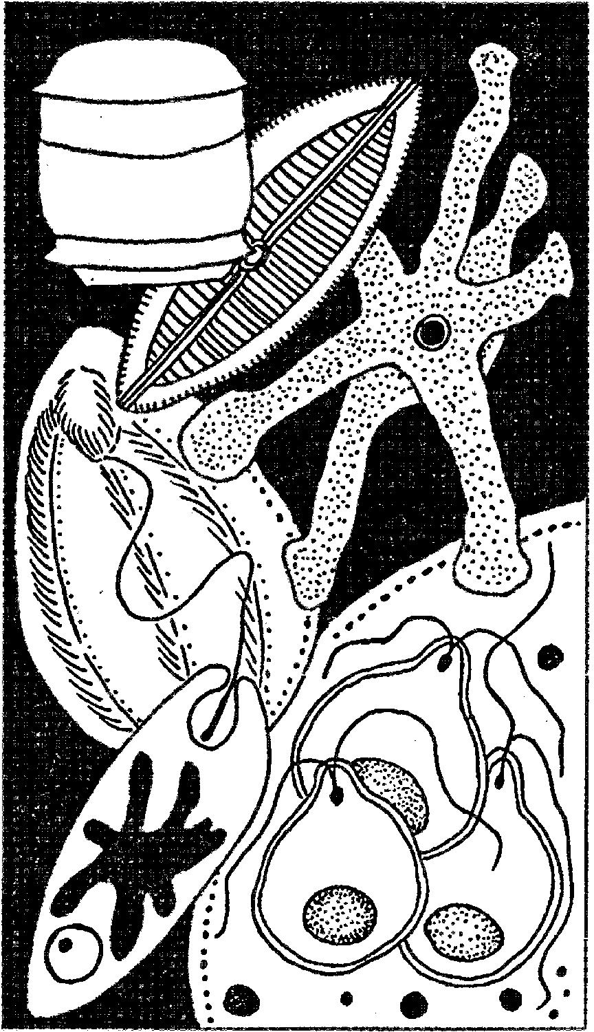 Если рассмотреть каплю взятой вами воды под микроскопом, вы увидите огромное множество разнообразных простейших: покрытую ресничками инфузорию–туфельку, ее врага – хищную инфузорию бурсарию, эвглену зелёную, которую легко отличить по красному глазку, зеленой окраске и единственному жгутику. (Чтобы поймать эвглену, пробу лучше брать ближе к поверхности воды на хорошо освещенных участках водоема. Как вы думаете, почему?)