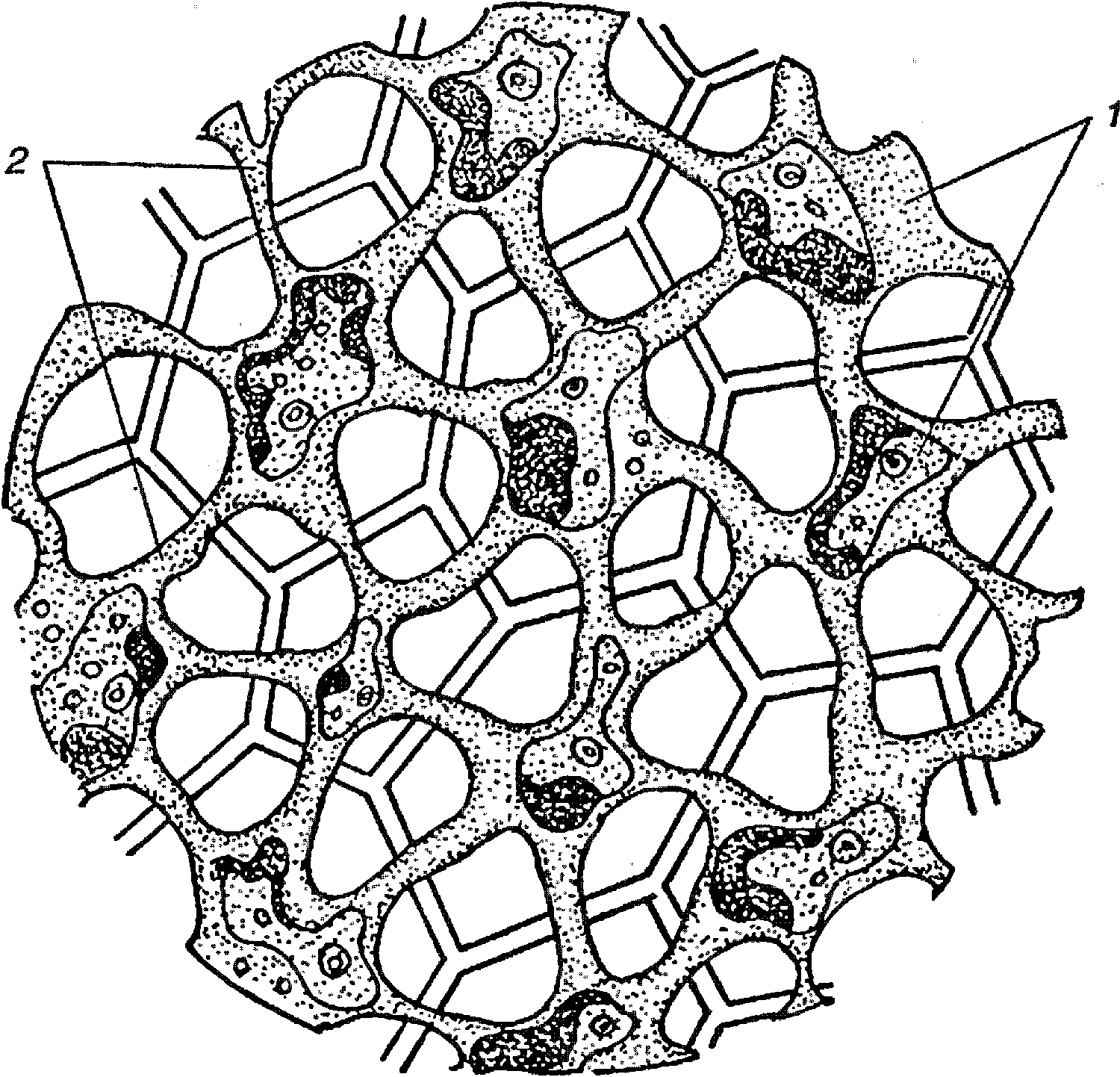 Участок колонии вольвокса (сильно увел.). 1 – отдельные клетки; 2 – цитоплазматические мостики между клетками