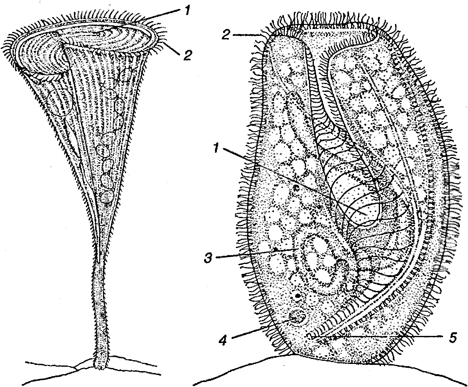 Крупные инфузории трубач (слева) и бурсария (справа) видны невооруженным глазом. Край ротовой воронки (1) трубача покрыт ресничками (2), которые загоняют в ротовое отверстие пищу трубача – бактерии и мелкие водоросли. Бурсария прозрачна, поэтому внутри клетки хорошо видно лентовидное ядро (3) и темные пищевые вакуоли (4), в которых происходит переваривание пищи. Бурсария – хищница, и питается другими инфузориями и жгутиконосцами, которых загоняет в ротовое отверстие (5) движением ресничек.