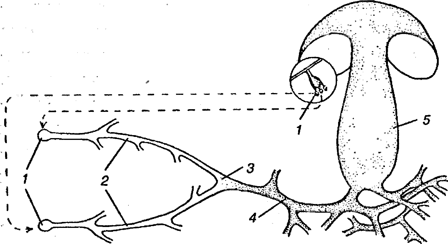 Плодовое тело шляпочного гриба1 – общий вид; 2 – пластинки на нижней стороне шляпки; 3 – край пластинки при увеличении; 4 – материнская клетка (базидия), образующая 4 споры (5)