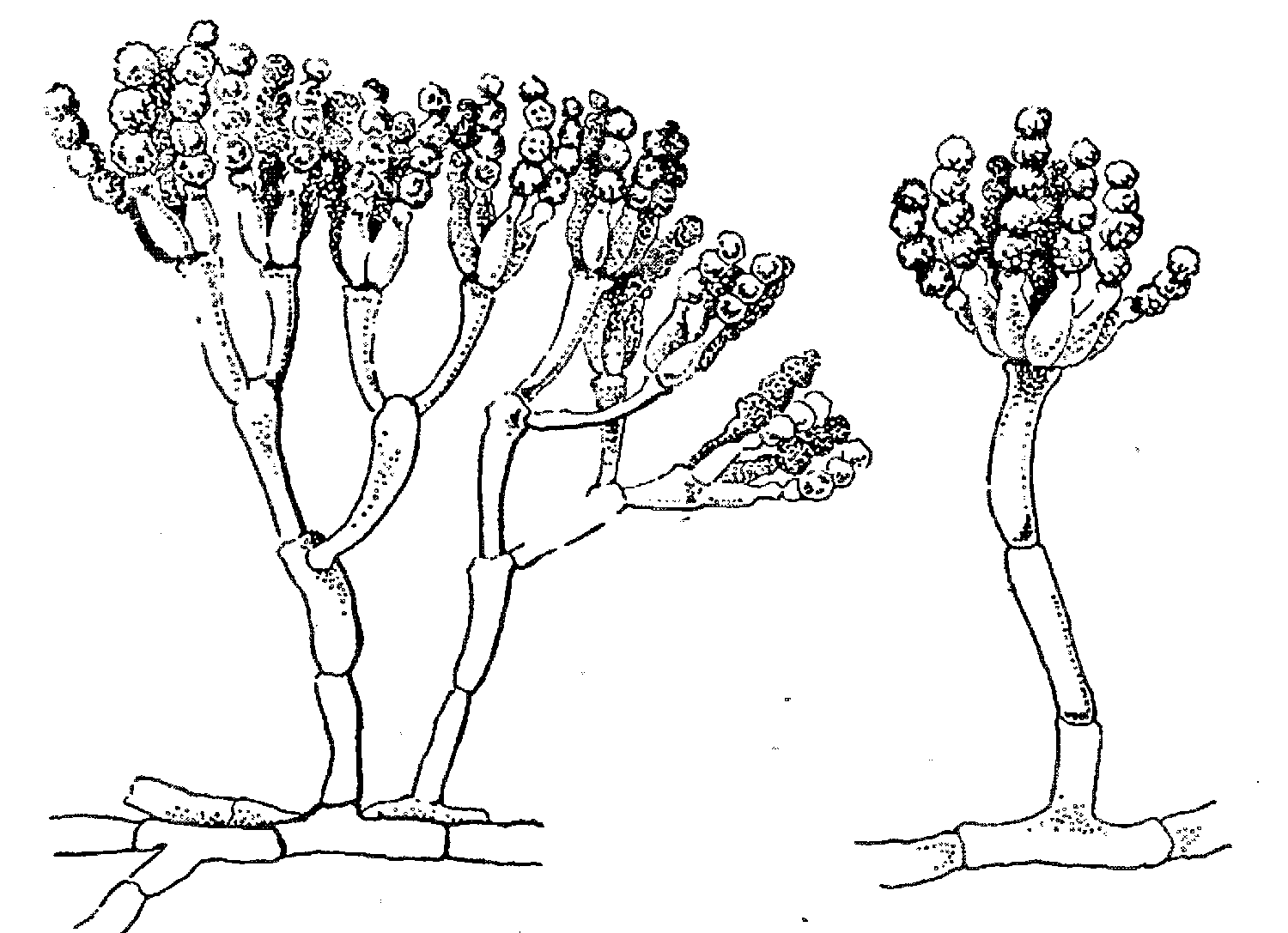 Органы размножения плесневых грибов: 1 – спорангий мукора; 2 – конидии аспергилла;3 – конидии пеницилла