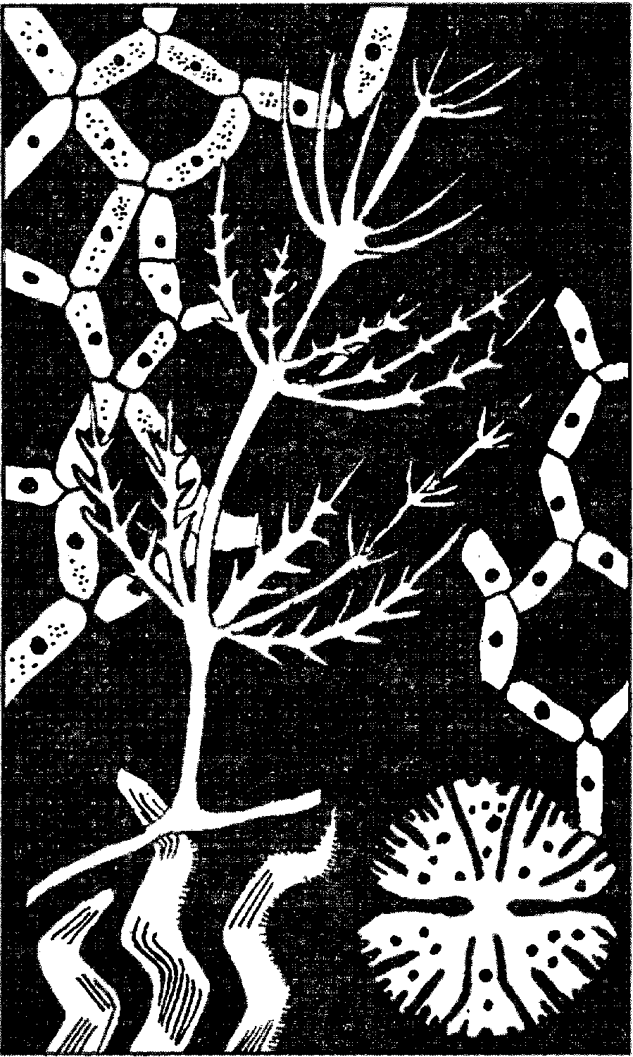 Даже у самых сложно организованных водорослей нет ни листьев, ни стеблей, ни корней, как у высших растений. У водорослей отсутствуют ткани, из которых состоят органы высших растений. Их слоевище образовано почти одинаковыми клетками, и каждая – мастер на все руки: фотосинтезирует, поглощает из воды минеральные соли, хранит запасы питательных веществ, почти каждая может образовать органы размножения.