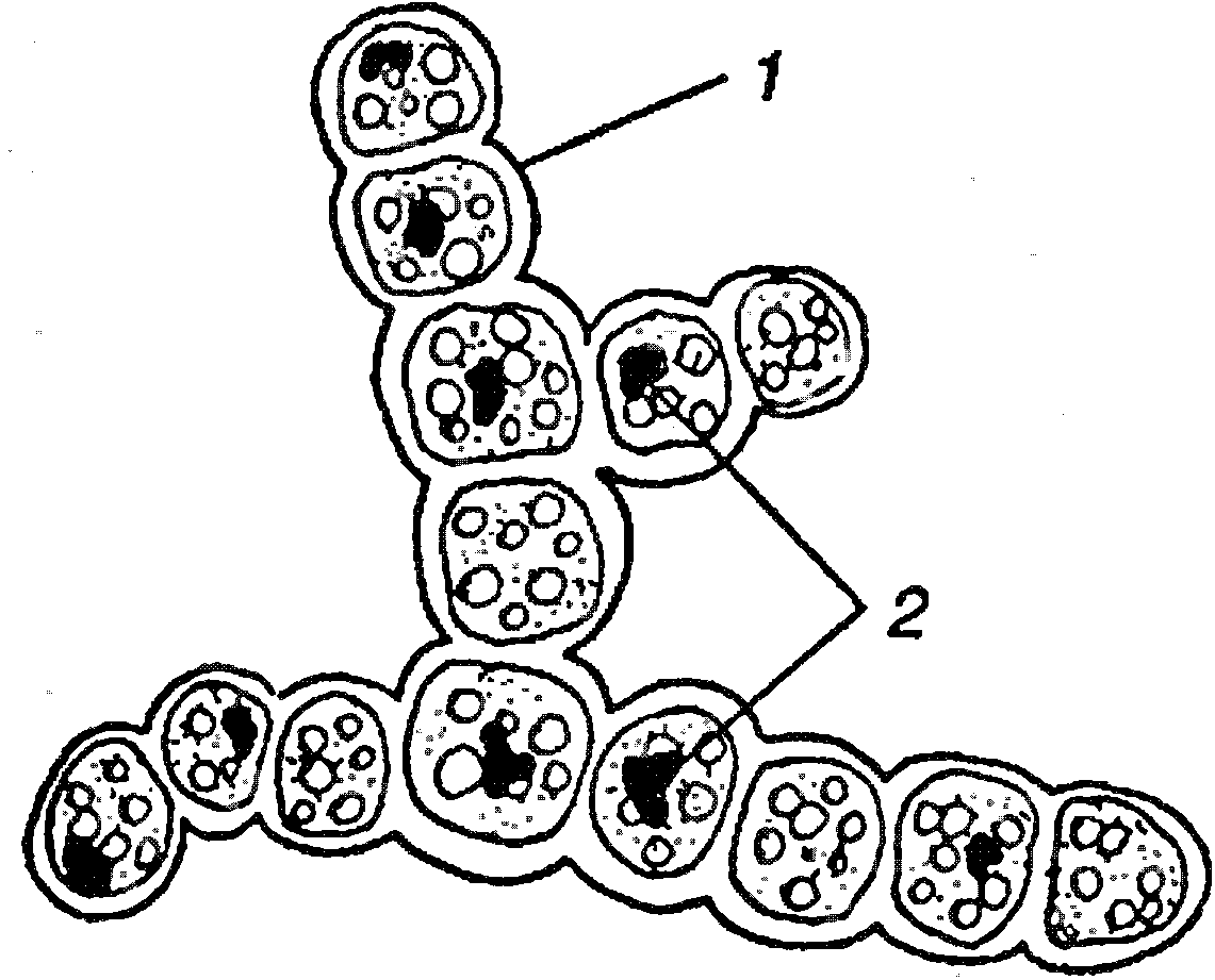 Трентеполия. 1 – толстостенные оболочки; 2 – капли масла
