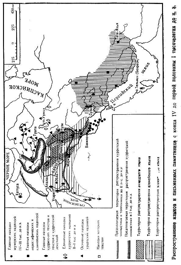 Уже во времена Саргона Аккадского северная часть Месопотамии находилась под сильным влиянием совершенно новой этнической группы – хурритов, составлявших наряду с семитами, шумерами и эламитами четвертый этнический элемент, сыгравший существенную роль в истории Месопотамии. Происхождение хурритских племен до сих пор остается невыясненным, а их язык – наименее изученным среди прочих древневосточных языков. С текстом на хурритском языке исследователи впервые встретились в 1887 г. во время раскопок в Эль-Амарне. Обнаруженное тогда письмо митаннийского царя Тушратты к египетскому фараону Аменхотепу III (около 1380 г. до н. э.), состоявшее из 478 строк, пока является наиболее обширным из всех известных хурритских текстов, число которых, особенно благодаря находкам в Хаттусе (Богазкёй), существенно возросло. Большую ценность представляют некоторые двуязычные хурритско-хеттские тексты, поскольку хеттский язык сравнительно хорошо изучен. Некоторое количество текстов, главным образом ритуальных, найдено в различных районах Междуречья, в городах Ниппур, Вавилон, Мари. Хурритские тексты обнаружены также в Угарите.