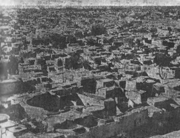 Город окружала глиняная стена, толщина которой была 15 футов, а высота – 30; по обе стороны от стены– глубокий ров. В город вели пятнадцать ворот, которые с заходом солнца закрывались и открывались только на рассвете. Территория города напоминает овал неправильной формы; большое стоячее озеро Джакара как бы рассекает его с востока на запад на две части. Через озеро тянется узкая полоса земли, на которой расположен рынок. В период дождей она затопляется, и в связи с этим вся торговля приурочивается к сухому газону.