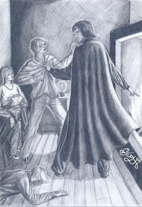 – Стой! Уизли, кому говорю! – завопил Снейп. – Немедленно убирайтесь отсюда, я сам позабочусь о Поттере!