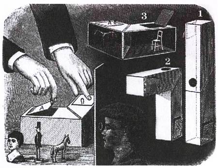 Если теперь заглянуть в круглое окошечко, то ослика не будет видно, поскольку он находится в полной темноте. Но если стул в это время освещен ярким светом солнца или лампы, он отразится в стекле, как в зеркале, и вы увидите его на том самом месте, где только что стоял ослик.