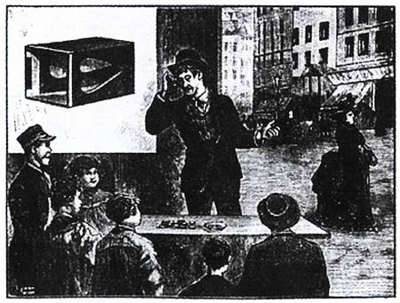 Суть фокуса такова. Представьте: уличный торговец продает маленькие коробочки и кричит: «Последнее изобретение! Чудо оптики! Аппарат, который дает возможность видеть, что делается у вас за спиной! Глядя в этот чудесный ящичек, я сейчас скажу, что делается позади меня. Вот прошел человек с зонтиком. Вот проехала повозка. Вот идет женщина с черной сумочкой в руках. Покупайте, спешите убедиться!»