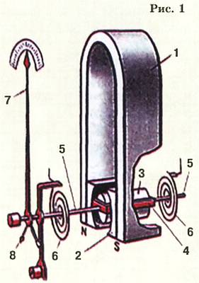 Сейчас в обиходе почти исключительно приборы (измерительные головки) магнитоэлектрической системы (рис. 1). В них имеется постоянный магнит 1с полюсными наконечниками 2и сердечником 3, между которыми создается однородное магнитное поле. В нем может поворачиваться рамка 4с обмоткой из многих витков тонкого провода, закрепленная на оси 5. Ток в рамку подается через спиральные пружинки 6, создающие момент, противодействующий повороту рамки. С осью соединена стрелка 7с противовесами 8, сбалансированными так, чтобы стрелка не отклонялась при поворотах и наклонах всего прибора.
