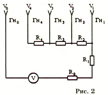 Если мы хотим построить многопредельный вольтметр, нужно использовать несколько добавочных сопротивлений, по числу пределов. Их можно переключать обычным поворотным переключателем, как в тестерах. Но можно поступить и проще, сделав несколько гнезд, по числу пределов измерения, и переставляя щуп в нужное гнездо (рис. 2).
