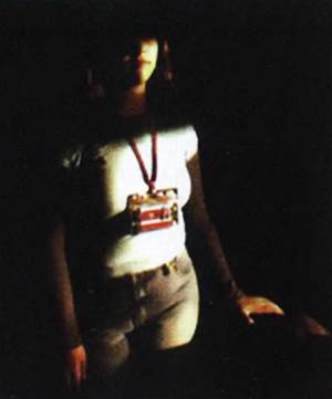 Школьница с биркой-радиочипом на груди.