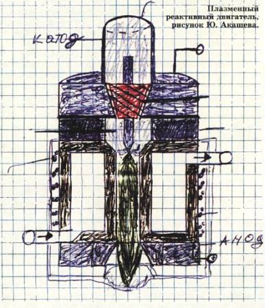 …описал в своем письме девятиклассник Юрий Акашев из поселка Мамаевка Переволоцкого района Оренбургской области. Двигатель состоит из вольфрамовой камеры, соединенной с источником высокого напряжения и играющей роль катода. В камеру подается водород. Затем его поток поступает в спиральный конический канал, где начинает вращаться с большой скоростью. Далее он попадает в разрядную камеру. Здесь под действием высокого напряжения на конце заостренного металлического стержня он ионизируется, а потом под действием все того же напряжения ускоряется.