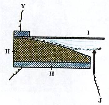 Y– верхний контакт; I– гибкая пластина из фольги; Н– слой камня; II– нижняя обкладка; J– нижний контакт.