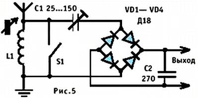 Он содержит открытый колебательный контур, образованный катушкой L1 и емкостью антенны относительно земли. Контур настраивается на частоту принимаемой мощной станции и выделяет ее модулированный по амплитуде (AM) высокочастотный сигнал. Он через конденсатор связи С1 подается на мостовой детектор, собранный на четырех высокочастотных германиевых диодах VD1 – VD4.