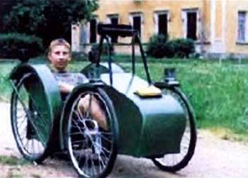 Двигатель – переделанный стартер от автомобиля «Ока» с постоянными магнитами, а питается он от двух аккумуляторных батарей 6В 75А/Ч. Автомобиль развивает скорость до 20 км/ч. Рама его изготовлена из досок и водопроводных труб.