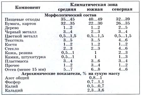 Таблица, показывающая состав мусора в различных регионах нашей страны.