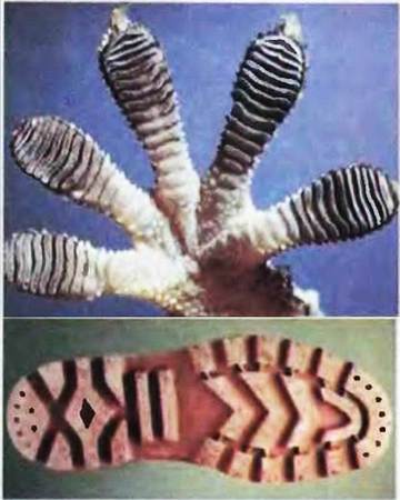 О том, что тропические ящерицы гекконы умеют бегать по стенам и потолку, известно давно. Но лишь сравнительно недавно исследователи поняли, на чем основано это умение. Когда на лапки ящериц взглянули через микроскоп, то обнаружили, что они словно бы ходят в кроссовках; на подошвах пальцев есть специальные роговые наросты, которые образуют словно бы протекторы-присоски. Благодаря им гекконы и могут удержаться на гладкой поверхности.