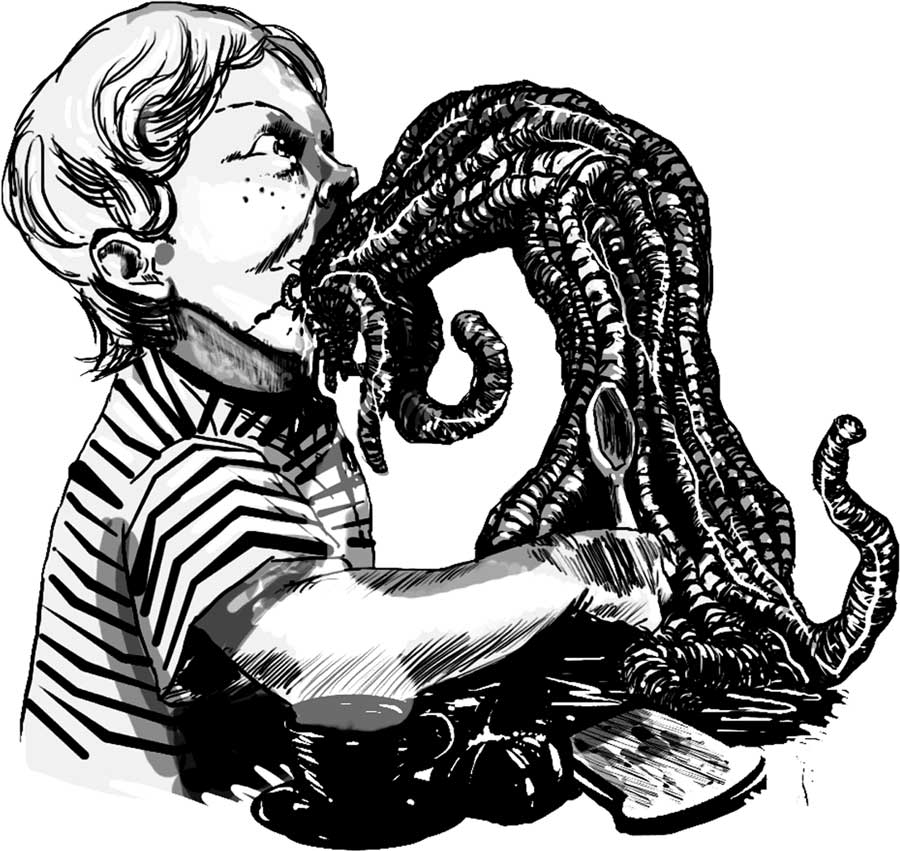 А черви все шли и шли из него, шли и шли, настойчиво и целенаправленно – в миску с едой. Тушенка с помидорами и хлеб уже скрылись под слизистой пульсирующей кучей, а те черви, которые уже не помещались в миске, ползали по столу, жадно пожирая крошки. Они облепили банку из-под тушенки, нож, которым Олег резал хлеб, – все, что когда-либо касалось еды. В воздухе нарастал едва заметный, но уже ощутимый густой и липкий звук чавканья, всасывания и втягивания в себя.