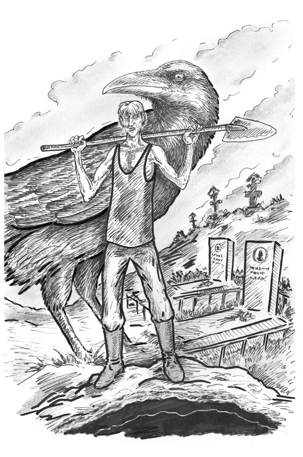Тот лишь кивнул, поджав губы, рывком распахнул дверь и выбрался наружу. Точно по команде, могильщик закинул лопату через плечи, свесив руки по обе стороны черенка. Он был похож на тощее пугало, выставленное в поле, чтобы пугать ворон. Вот только вороны его не слишком-то боялись. Гигантская черная туша Хугинна аккуратно спланировала с неба, встав рядом с могильщиком. Долговязый, словно только этого и ждал, поднял правую руку, приложил два пальца к виску, по-приятельски козырнув Кашину.