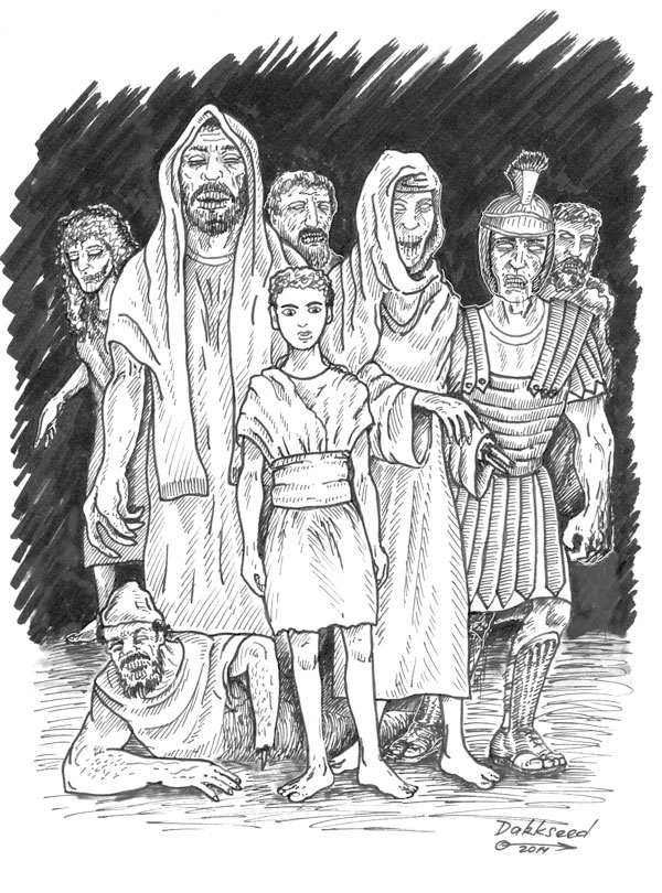 Мертвецы бежали молчаливой толпой. К полудню из-за холма показался Гадар, стоящий у берега моря, и прохладный ветерок остудил пылающую грудь мальчика. С дозорных постов заметили бегущих людей, и по звуку рожка навстречу вышел строй латных легионеров. Мертвец поставил на землю Хаима и вместе с остальными ринулся на красные щиты римских воинов. Их строй разомкнулся, пропуская вперед лучников, и рой стрел снес бегущую толпу.