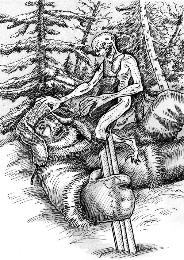 Снежный горб вспучился, взорвался мощным фонтаном снега прямо в лицо Сереброву, залепляя глаза, сбивая прицел, дезориентируя. Он скорее почувствовал, чем действительно увидел, как из сугроба вынырнуло бледное и отчего-то совершенно безволосое тельце. В невероятном прыжке, с легкостью преодолев трехметровую отметку, оно с силой врезалось в грудь охотника, опрокидывая его на спину. Серебров грохнулся на снег, показав темнеющему небу подошвы унтов. «Сайга», недовольно рявкнув куда-то в сторону леса, отлетела, едва не выломав руку.