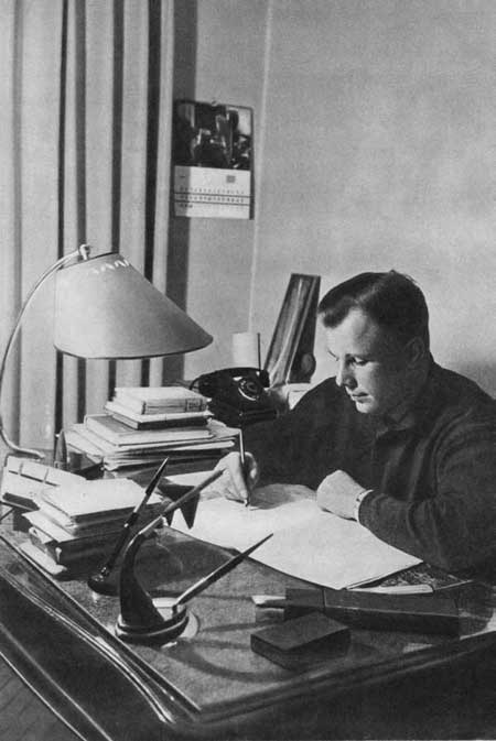 Многим знаком этот кабинет. Книги и справочники, географические и астрономические карты, глобус, записные книжки, испещренные заметками, лежали на столе и на книжных полках у стены. Здесь собирались космонавты, здесь обсуждались планы тренировок, здесь он отвечал на вопросы журналистов.
