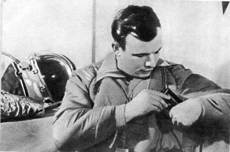 Вот он спокойно положил в карман своего космического костюма удостоверение советского космонавта № 1.