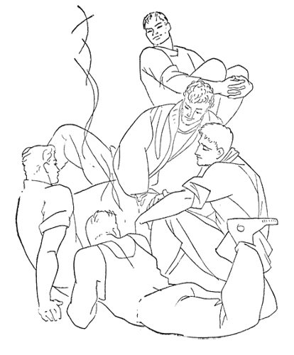 Он не оставлял безнаказанно ни одной ошибки, ни одной оплошности ни в стойке, ни в положении лежа. Работал легко, без напряжения, полностью расслабляясь, и вдруг неуловимо для глаз проводил прием. Невозможно было заранее предугадать, что он задумал. А если партнер не делал ошибок или становился в глухую стойку, упираясь всеми силами, он неожиданной комбинацией заставлял его терять ориентировку, и тот все равно попадался.