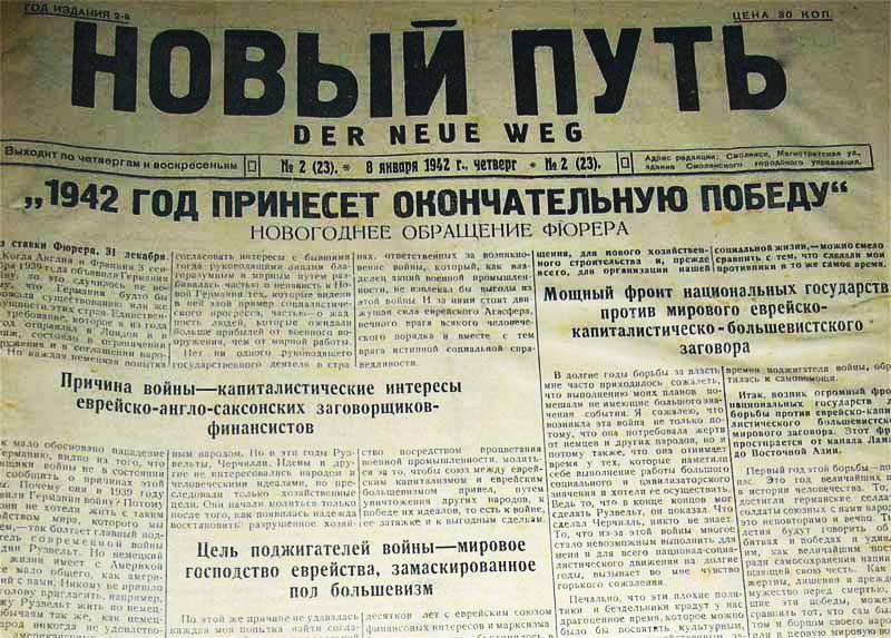Нет. Не своим гнусным содержанием. А только лишь датой издания. Восьмое января сорок второго года. И издавалась эта пасквильная газетка в Смоленске.
