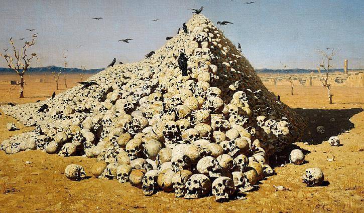 Получилась некая художественная инсталляция, слегка напоминающая картину известного художника Верещагина «Апофеоз войны». Наконец, головы кончились, а я хоть немного но успокоился. Хотя меня по-прежнему чуть потряхивало от всего произошедшего. Но даже если бы меня спросили, что меня потрясло больше, убийство почти целого племени дикарей, или осознание того, что не только Мирко и Славка, но и мы с Машей, могли оказаться съеденными этими дикарями… Я бы очень сильно затруднился бы с ответом. Скорее всего всё вместе и сразу…