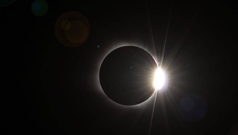 Кое-как, прищурившись, мне всё-таки удалось рассмотреть астрономическое чудо поподробнее. Солнце выглядело, как огромное кольцо с ослепительно сияющим камнем, почему-то зависшее посреди неба.