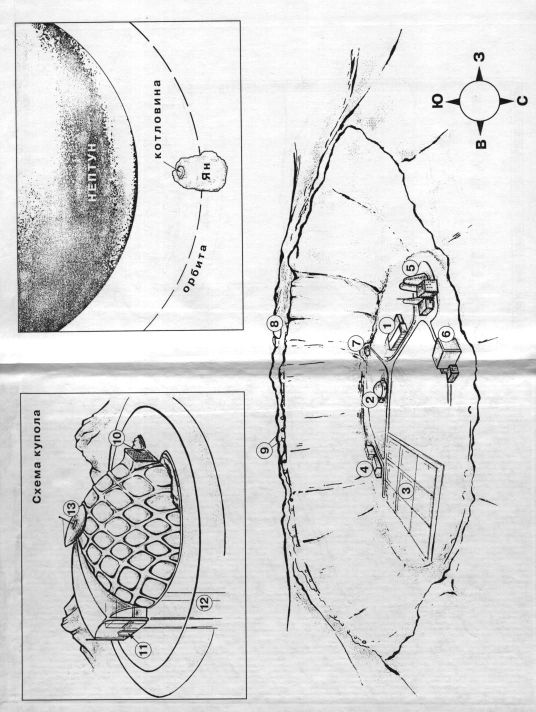 8 – защитный купол, внутри которого находятся гараж и мастерская; выходной шлюз; шахта лифта (12), связывающего купол с дном котловины; на крыше купола – антенна (13);