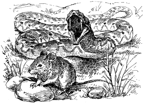 На серой потрескавшейся скале лежала большая змея. Она была абсолютно неподвижна, и только черный, раздвоенный язык на секунду появлялся из полуоткрытой пасти. Рядом сидела на задних ножках крошечная песчанка и, раскачиваясь, неотрывно смотрела на змею темными бусинками глаз.