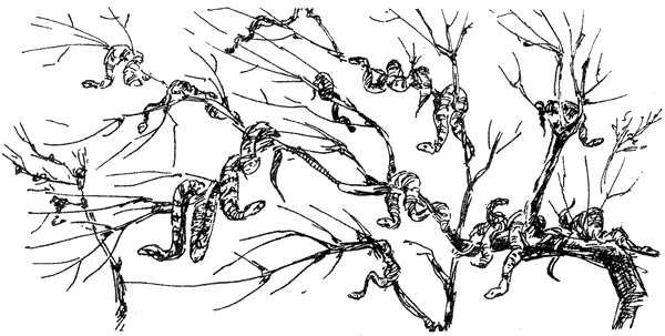 Сбросив на землю пару змей, мы спустились вниз и помогли Павлику быстро изловить оглушенных падением гюрз. Солнце клонилось к горизонту, а заниматься ловлей в сумерках было рискованно, поэтому мы решили сделать перерыв, отойти подальше от «змеиного сада» и устроить ночлег, приняв меры предосторожности. С сожалением покидали мы лес, ветки которого были отягощены столь необычными плодами. Проходя мимо развесистого, с искривленным шишковатым стволом дерева, Василий увидел на нем несколько змей. Схватив валявшийся на земле обломанный сук, он трахнул по стволу так, что гул пошел. Две небольшие змейки сорвались с веток и упали едва ли не на голову бесшабашному парню. Василий собирался повторить свой маневр, однако я удержал его.