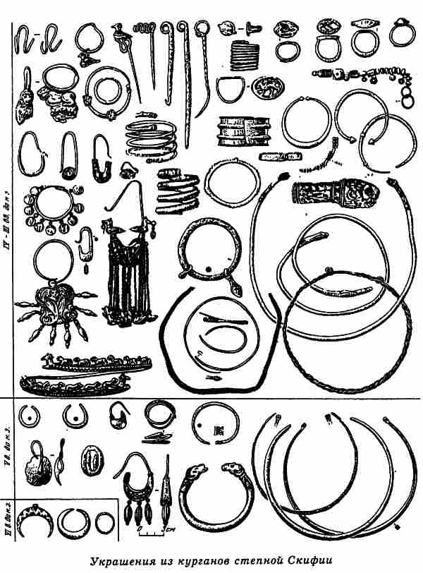 Хорошо известно, что многие сюжеты, изображенные на драгоценных предметах из причерноморских курганов, имеют местное происхождение. Это сцены скифских сражений, как на золотом гребне из кургана Солоха, сцены укрощения диких коней, как на серебряной амфоре из Чертомлыкского кургана, просто изображения скифских всадников, как на золотой гривне из Куль-Обы. «Типовым» сюжетом был скифский миф о первопредке, выигравшем состязание с натягиванием лука, как на электровом сосуде из Куль-Обы или аналогичном изделии, найденном под Воронежем. Знаменитая пектораль из кургана Толстая Могила представляет собой изображение трех частей мира в представлении скифов: нижняя – мир хаоса (грифоны, терзающие коней), верхняя – идеальный мир «порядка» (люди, занятые ритуальной обработкой «золотого руна», и домашние животные в спокойных позах) и средняя – связующее эти два мира «древо жизни» (растительный орнамент).